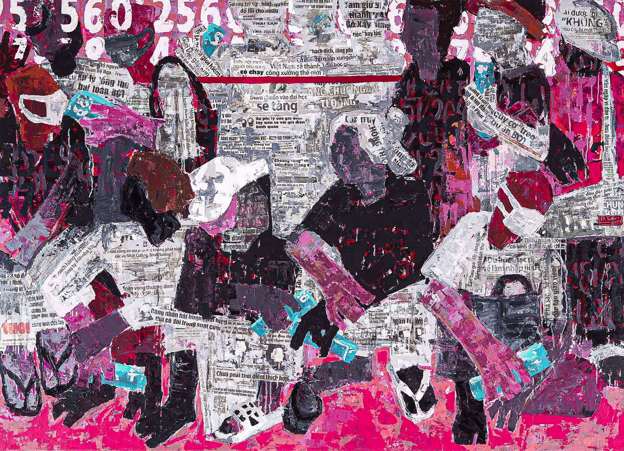 Từ năm 2016 đến 2019, anh bước sang cuộc chơi khác với “Bên Trong Thành Phố”. Lần này, chất liệu không là sơn dầu hay màu acrylic, mà còn là những tờ giấy báo cũ kỹ, những mảnh ghép thông tin xô lệch, những vệt màu loang lổ của đô thị đang xoay vần không ngừng. Pop Art trong tay anh không là sự tán dương văn hóa đại chúng, mà là sự châm biếm, là cách anh vẽ ra sự hỗn loạn, ngột ngạt, nơi con người bị nhấn chìm trong chính những mảng màu của thành phố mà họ tưởng rằng đã quá quen thuộc.