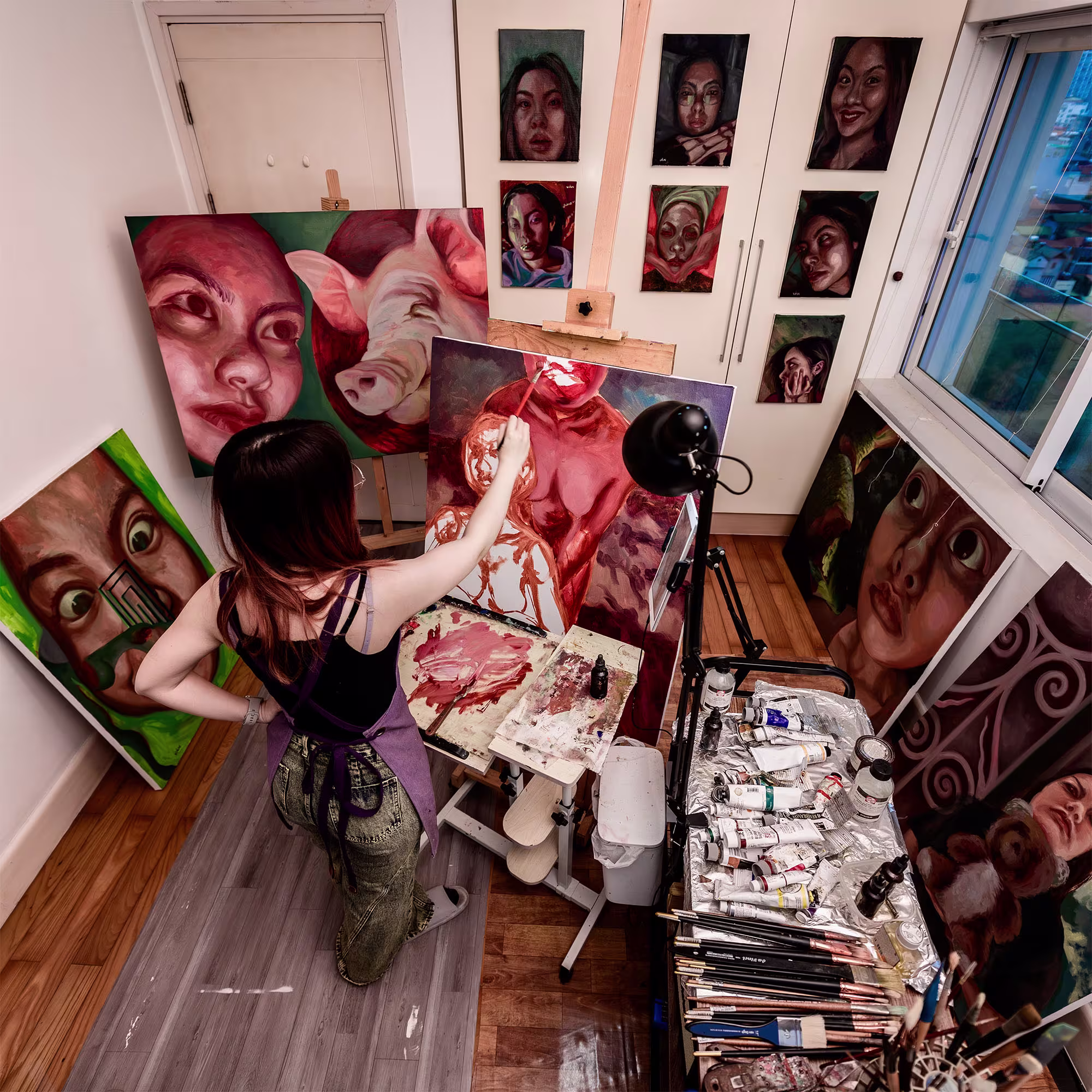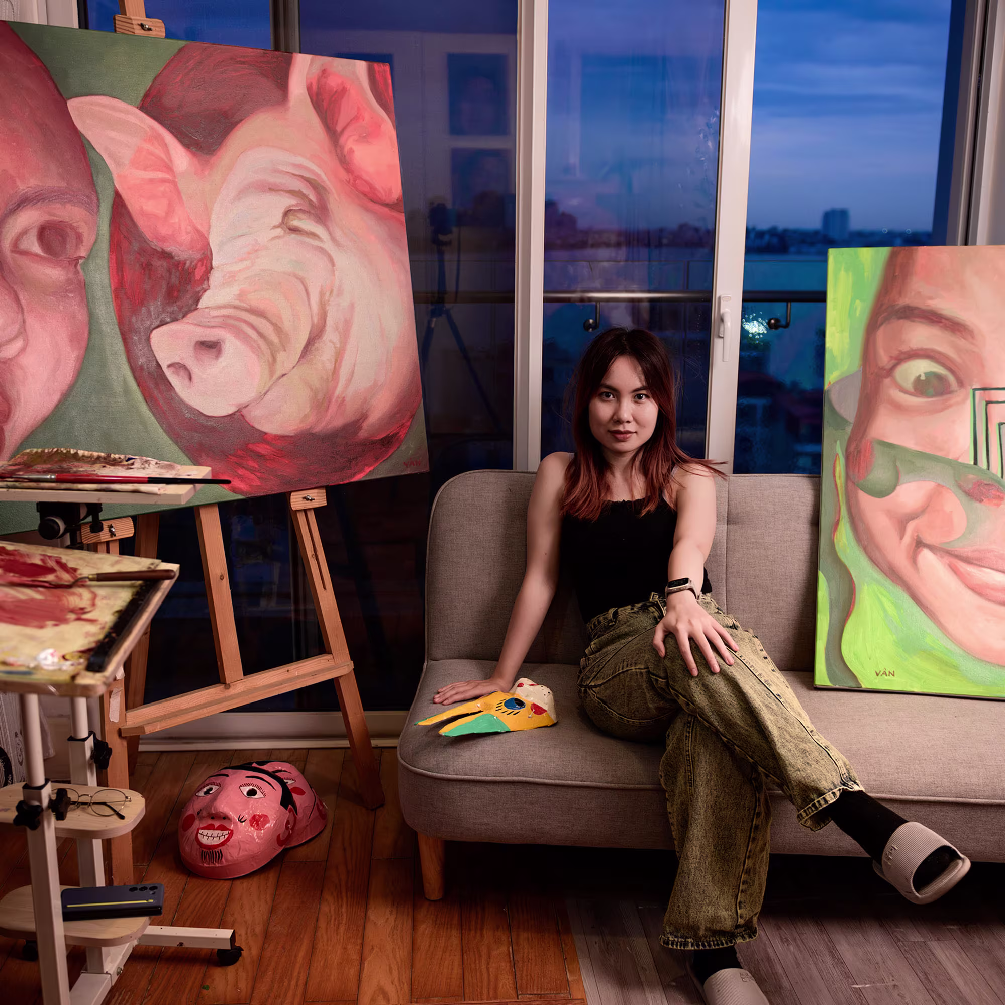 Khánh Vân theo học Hội họa tại Mỹ. Cô bộc lộ nội tâm phức tạp qua nét cọ mạnh mẽ, sắc đỏ rực, phản ánh xung đột trong cuộc sống phụ nữ bị áp đặt bởi xã hội. Tác phẩm của cô là lời thức tỉnh, an ủi những tổn thương và biểu tượng của sức sống mãnh liệt.