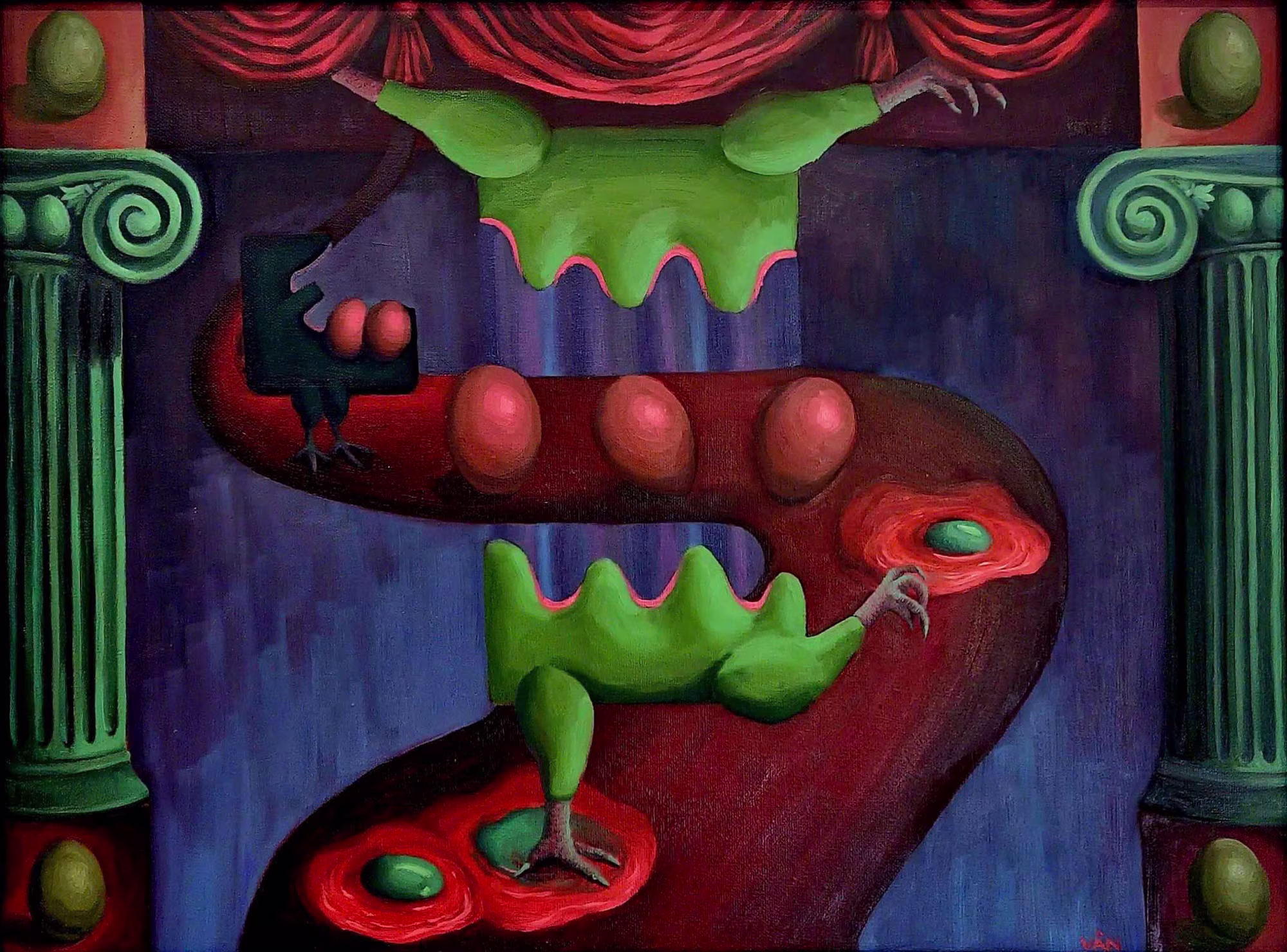 Hoạ sĩ chọn tông đỏ rực mắt như muốn phơi bày sự lố bịch trên sân khấu khi mọi vở diễn đều hoàn hảo nhưng sự thật liệu có luôn đẹp đẽ như vậy? Bức tranh mang theo nghi vấn của chính tác giả, rằng liệu mọi người có thật sự hạnh phúc hay họ chỉ muốn người khác thấy được vẻ ngoài lành lặn của mình nhưng lại giấu đi sự tan vỡ trong tâm hồn?