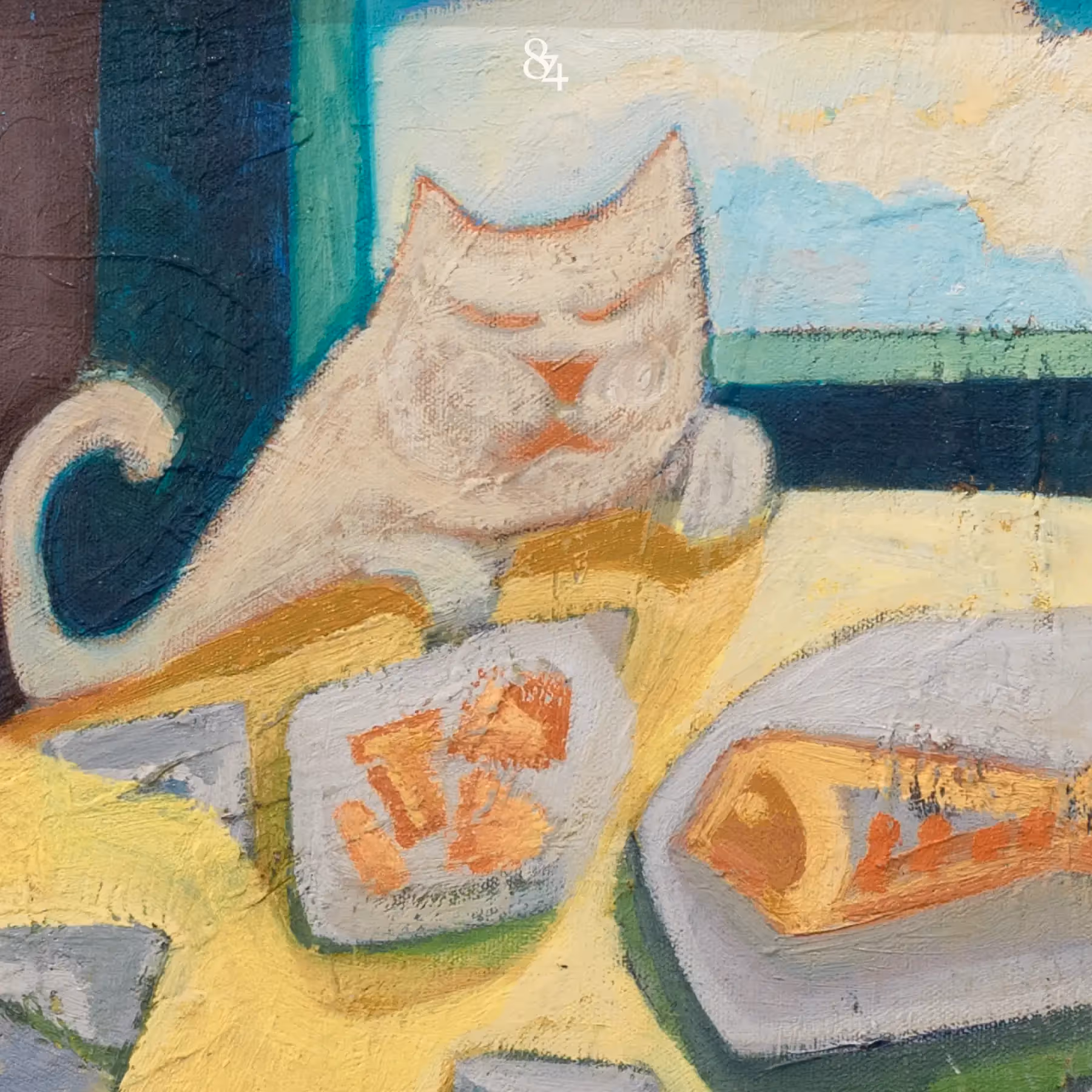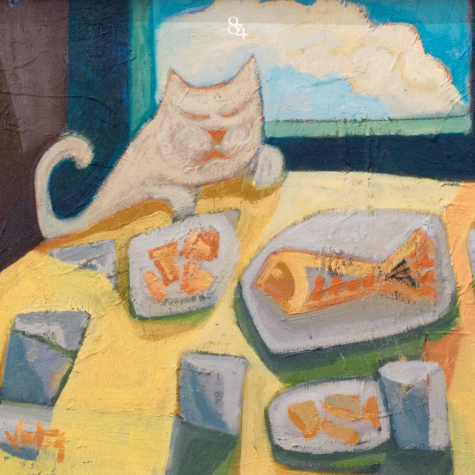 Một bức tranh dí dỏm và gần gũi với hình ảnh chú mèo ngồi thư thái bên mâm thức ăn. Màu sắc tươi sáng, bố cục đơn giản mà sinh động, tạo nên không khí ấm áp của một khoảnh khắc đời thường. Trong “No nê”, họa sĩ như muốn truyền lại chút niềm vui nhỏ bé, nhẹ nhõm và an nhiên của cuộc sống hàng ngày.