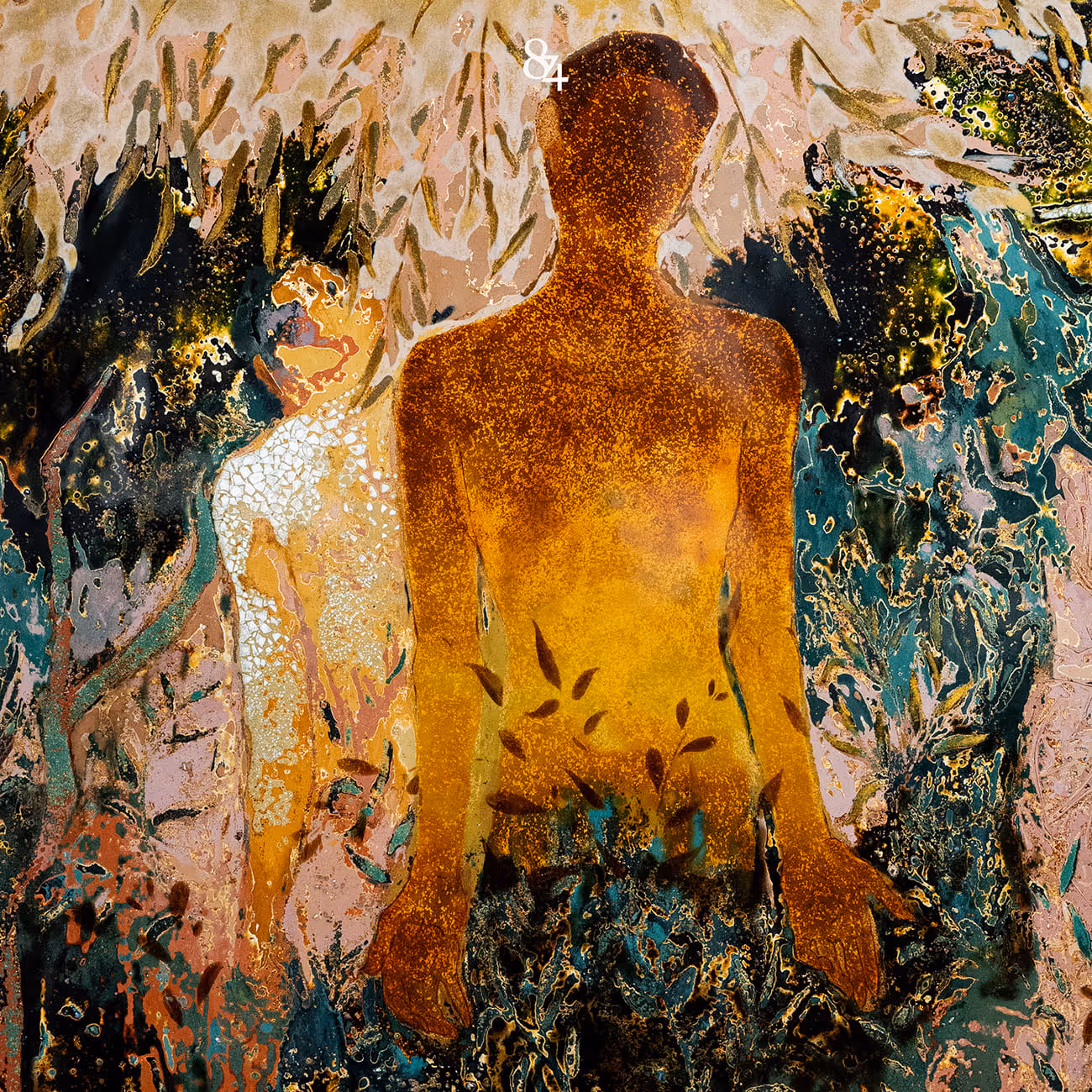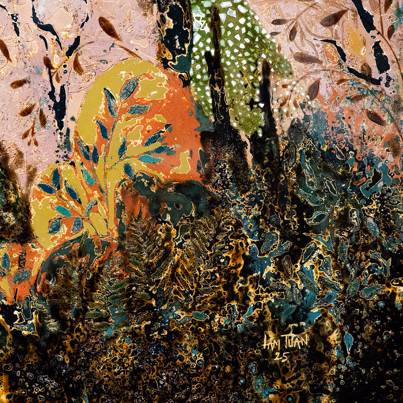 Bức tranh khắc họa những dáng người hòa mình vào không gian thiên nhiên, như đang lặng lẽ bước đi trong một dòng chảy vô hình của thời gian và cảm xúc. Các mảng màu ấm – lạnh đan xen tạo nên nhịp điệu thị giác gợi cảm giác chuyển động liên tục của đất trời và con người. Hình thể giản lược nhưng giàu biểu cảm, như những ký ức hay bóng dáng thoáng qua trong dòng đời.
