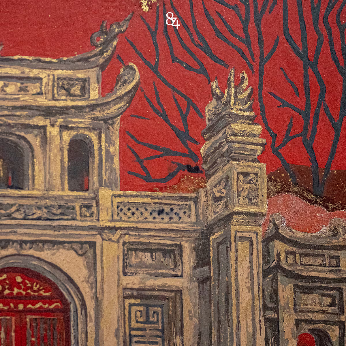 Bức tranh “Mộng Vinh Hiển” khắc họa cổng tam quan Văn Miếu với kiến trúc cổ kính và không khí trang nghiêm. Tác phẩm chắt lọc hình khối và sử dụng màu sắc đặc trưng, mang đến vẻ đẹp vừa uy nghi vừa giàu chất thơ cho di tích lịch sử này.