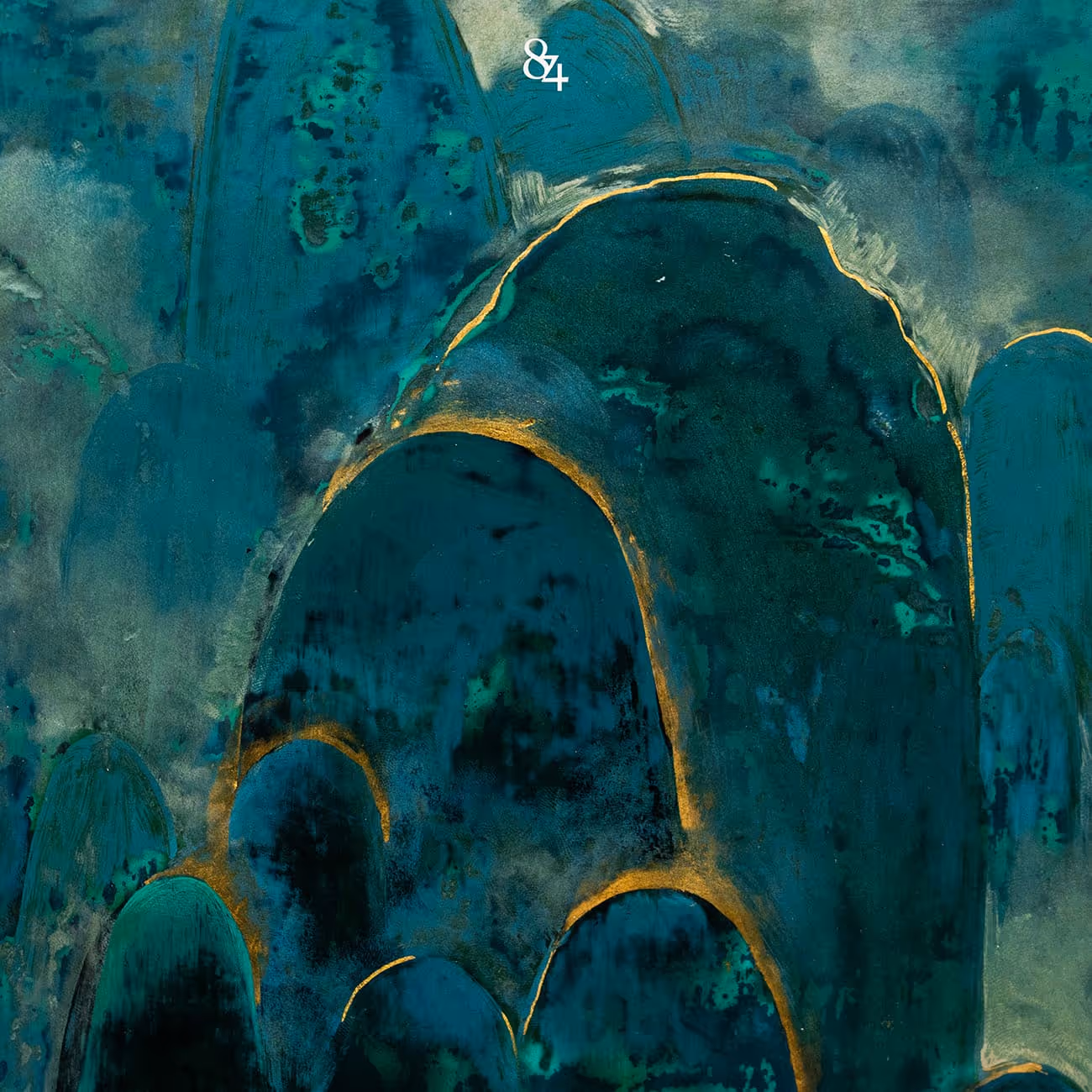 Bức tranh mở ra một không gian núi non xanh thẳm, nơi những dãy núi uốn lượn chồng lớp trong màn sương bảng lảng. Các mảng màu lam – lục sâu được xử lý mềm mại, tạo cảm giác vừa hư ảo vừa tĩnh tại. Ánh viền vàng mảnh khẽ lướt qua từng đỉnh núi như một vệt sáng ký ức, làm nổi bật chiều sâu của chất liệu.