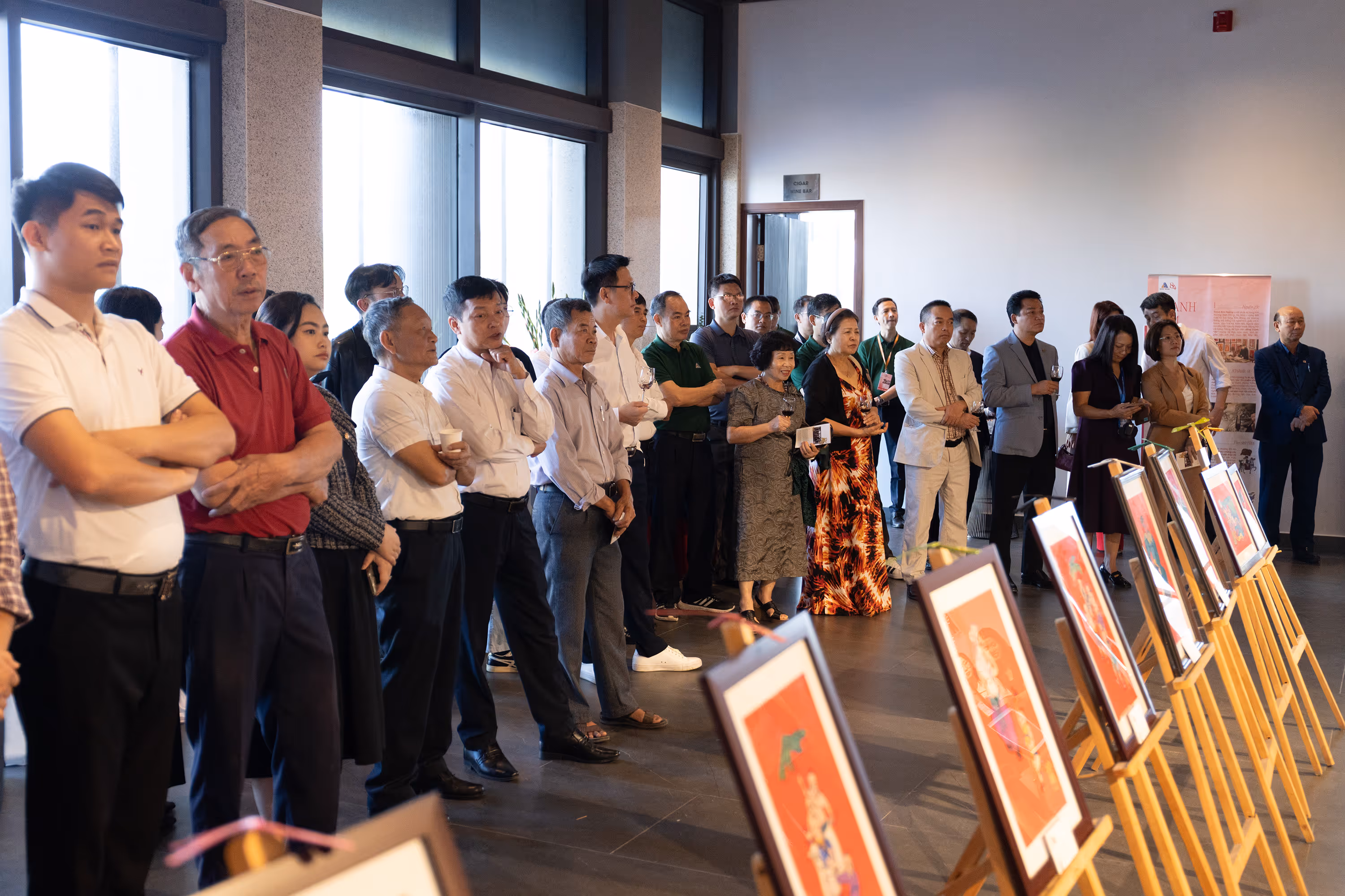Trong khuôn khổ triển lãm, anh không chỉ giới thiệu các tác phẩm Kim Hoàng quý giá mà còn trực tiếp chia sẻ câu chuyện, kỹ thuật và tinh thần của dòng tranh với công chúng.