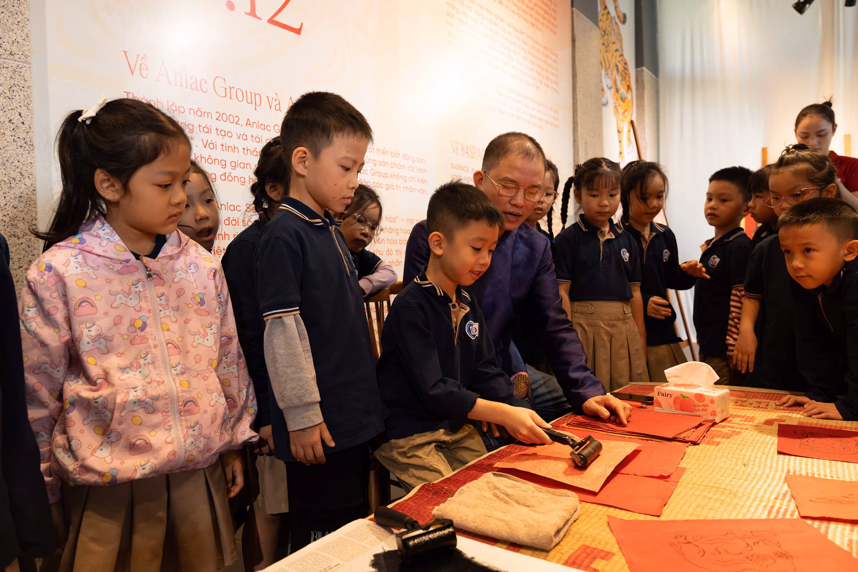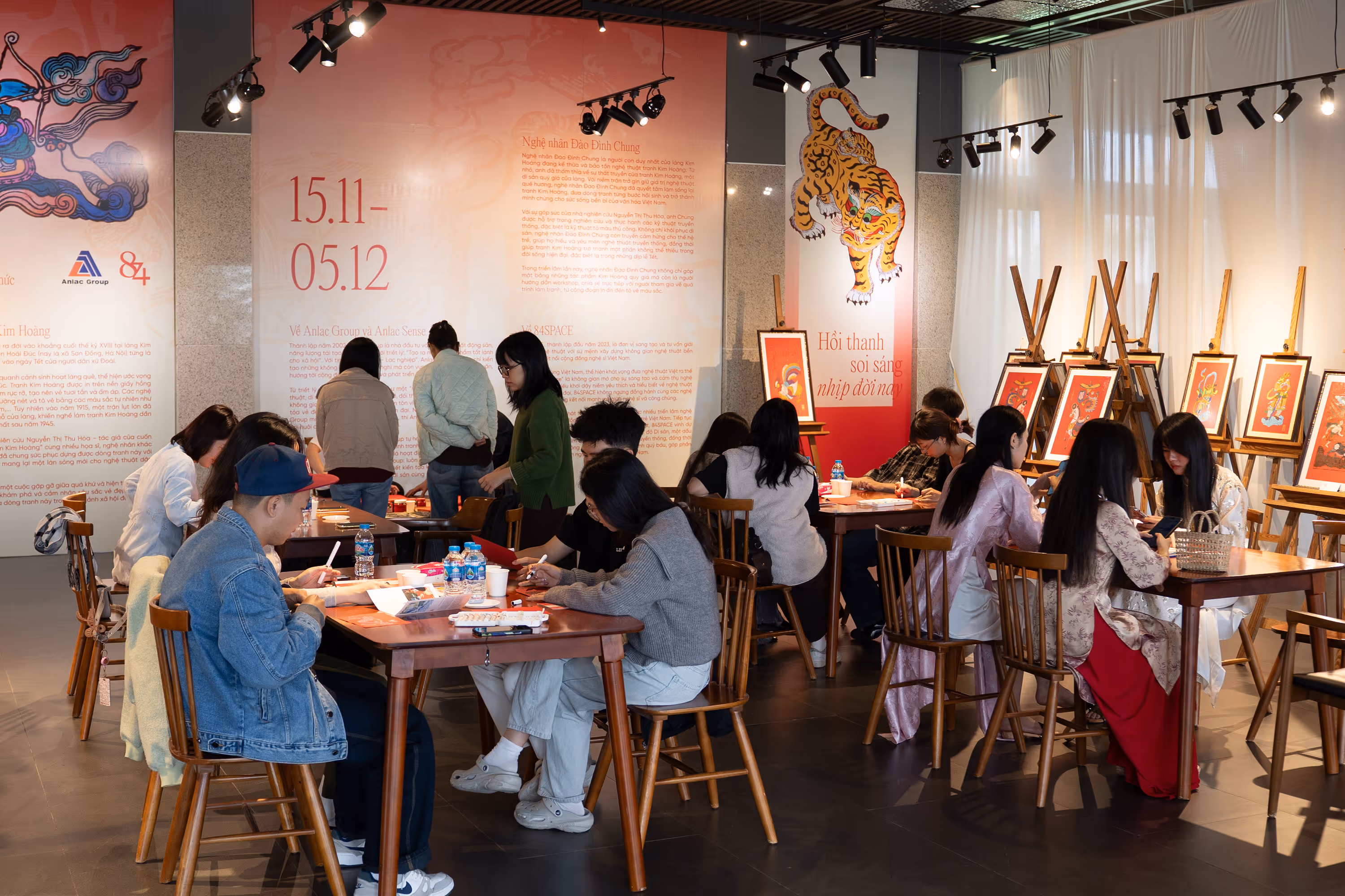 Đặc biệt, đến với triển lãm, người tham gia còn có cơ hội tham gia workshop trải nghiệm làm tranh Kim Hoàng. Dưới sự hướng dẫn của nghệ nhân Đào Đình Chung, người tham gia được trực tiếp khám phá quy trình làm tranh với ba bước cơ bản: in nét từ bản khắc gỗ, chấm phá màu sắc và in điểm nhấn để hoàn thiện tác phẩm.